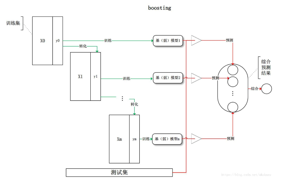 boosting顾名思义就是提升算法,即从弱分类器开始加强,通过加权来进行训练,基模型的训练过程为阶梯状,基模型的训练集会随着训练结果的变化而变化(调整权重),最后对所有的基模型的预测结果进行线性综合产生最终的预测结果