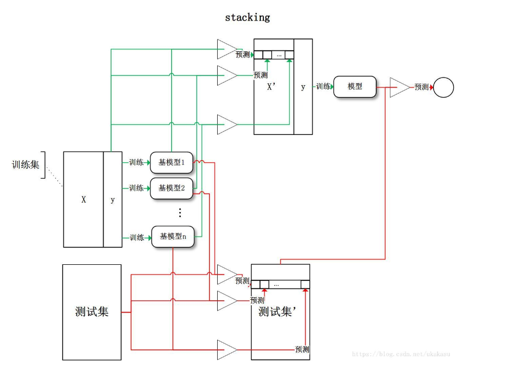 stacking即堆叠各种各样的分类器,主要思想就是训练一个模型用于组合其他各个模型,方法是利用所有训练好的基模型分别在原始训练集和原始测试集上测试(第j个基模型对第i个训练样本的预测值将作为新的训练集中第i个样本的第j个特征值),得到新的训练集和新的测试集